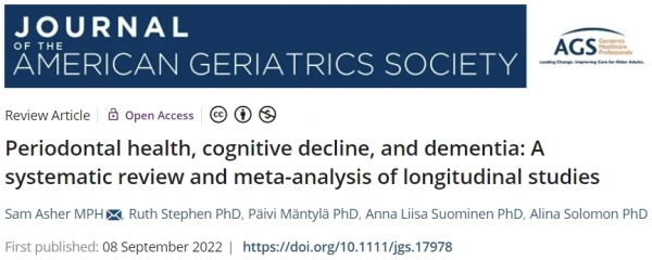 <논문> Asher S, Stephen R,Mäntylä P, Suominen AL, Solomon A. Periodontalhealth, cognitive decline, and dementia: Asystematic review and meta-analysis oflongitudinal studies. J Am Geriatr Soc. 2022;1‐15.doi:10.1111/jgs.17978.