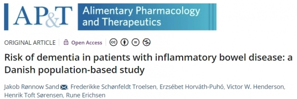 <논문> Rønnow Sand J, Troelsen FS, Horváth-Puhó E, Henderson VW, Sørensen HT, Erichsen R. Risk of dementia in patients with inflammatory bowel disease: a Danish population-based study. Aliment Pharmacol Ther. 2022 Sep;56(5):831-843. doi: 10.1111/apt.17119. Epub 2022 Jul 3. PMID: 35781292.