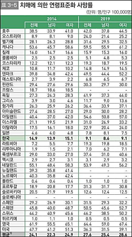 치매에 의한 연령표준화 사망률(이하 치매 사망률)은 국내 인구 10만 명당 9.1명으로 OECD 평균 치매 사망률인 27.6명보다 3배 정도 낮은 수치를 기록했다. 전체 순위로는 상위 8위권이다.