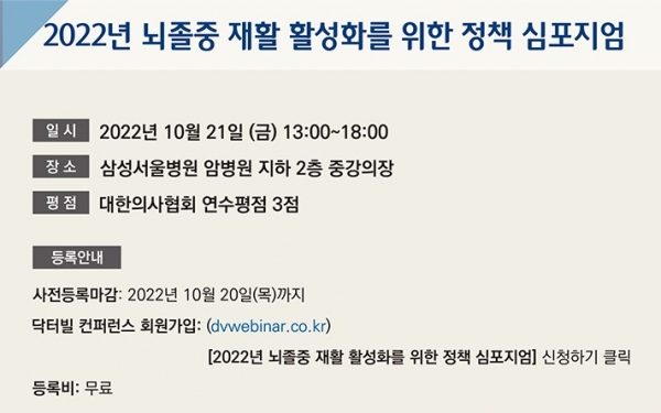 한국뇌졸중코호트연구단은 오는 21일 삼성서울병원 암병원 지하 2층 중강의장에서 '2022년 뇌졸중 재활 활성화를 위한 정책 심포지엄'을 개최한다.