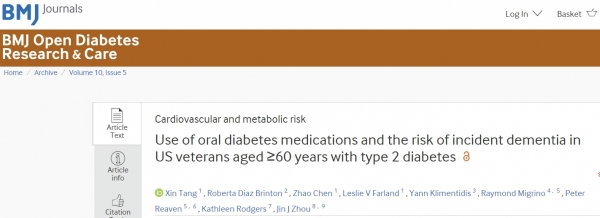 <논문> Tang X, Brinton RD, Chen Z, et al. Use of oral diabetes medications and the risk of incident dementia in US veterans aged ≥60 years with type 2 diabetes. BMJ Open Diabetes Research and Care 2022;10:e002894. doi: 10.1136/bmjdrc-2022-002894.