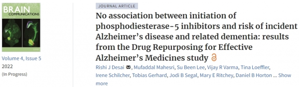 <논문> Rishi J Desai, Mufaddal Mahesri, Su Been Lee, Vijay R Varma, Tina Loeffler, Irene Schilcher, Tobias Gerhard, Jodi B Segal, Mary E Ritchey, Daniel B Horton, Seoyoung C Kim, Sebastian Schneeweiss, Madhav Thambisetty, No association between initiation of phosphodiesterase-5 inhibitors and risk of incident Alzheimer’s disease and related dementia: results from the Drug Repurposing for Effective Alzheimer’s Medicines study, Brain Communications, Volume 4, Issue 5, 2022, fcac247, https://doi.org/10.1093/braincomms/fcac247.