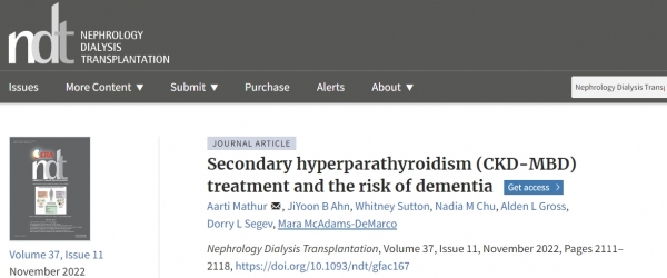 <논문> Aarti Mathur, JiYoon B Ahn, Whitney Sutton, Nadia M Chu, Alden L Gross, Dorry L Segev, Mara McAdams-DeMarco, Secondary hyperparathyroidism (CKD-MBD) treatment and the risk of dementia, Nephrology Dialysis Transplantation, Volume 37, Issue 11, November 2022, Pages 2111–2118, https://doi.org/10.1093/ndt/gfac167.