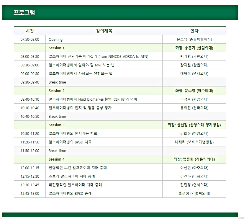 세부주제는 전임상 알츠하이머병부터 알츠하이머 치매에 이르는 연속적인 진단 기준의 변화, 바이오마커 활용 진단, 알츠하이머병의 실질적인 치료 등이 진행된다.