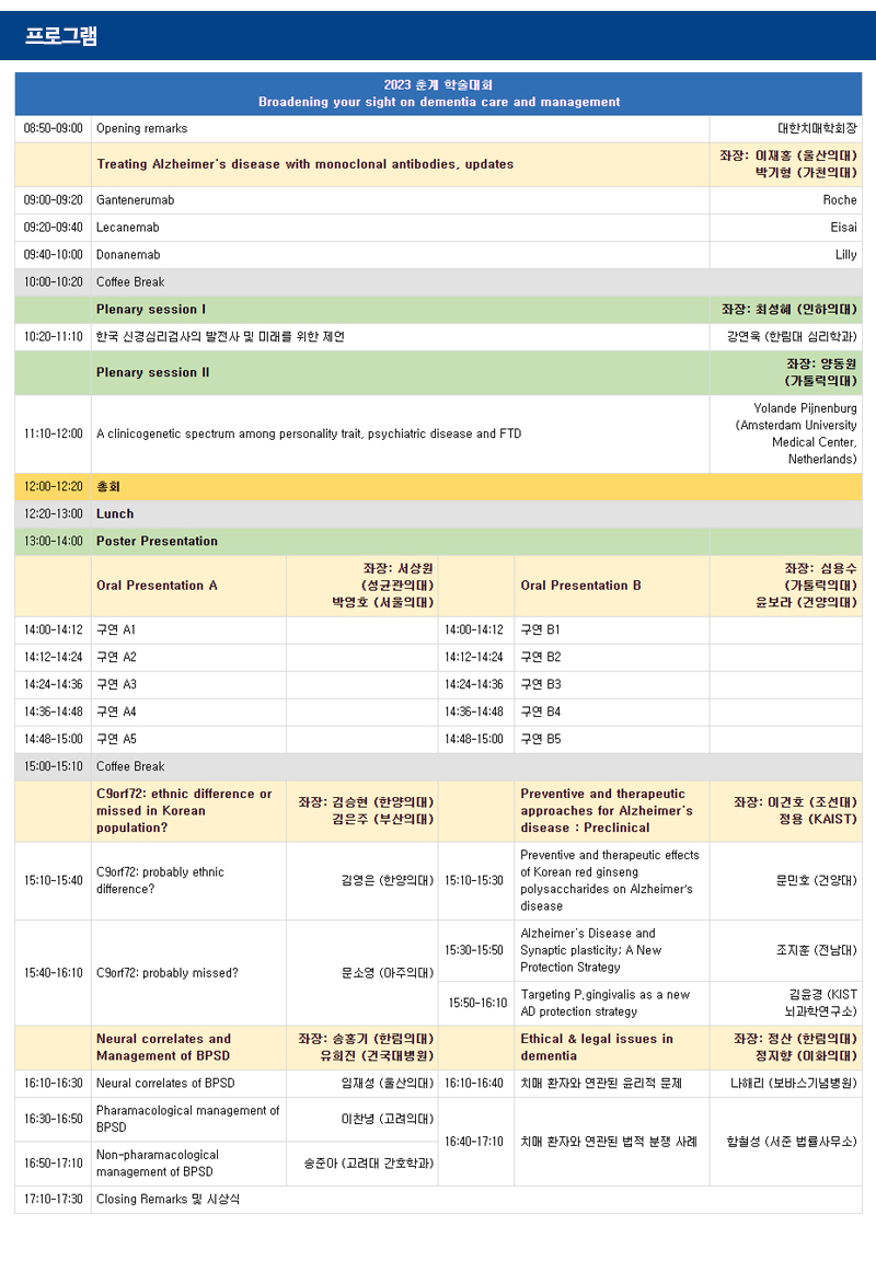 또 기조 강의로는 정년퇴임을 앞둔 한림대 심리학과 강연욱 교수의 치매진단 및 치료와 함께 한국 신경심리검사의 발전사와 제언, 네덜란드 Amsterdam University medical center의 Yolande Pijnenburg 교수의 전두측치매, 정신질환, 그리고 성격특성 사이의 임상유전학적 스펙트럼에 대한 강의가 진행된다.