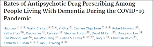 Luo H, Lau WCY, Chai Y, Torre CO, Howard R, Liu KY, Lin X, Yin C, Fortin S, Kern DM, Lee DY, Park RW, Jang JW, Chui CSL, Li J, Reich C, Man KKC, Wong ICK. Rates of Antipsychotic Drug Prescribing Among People Living With Dementia During the COVID-19 Pandemic. JAMA Psychiatry. 2023 Mar 1;80(3):211-219. doi: 10.1001/jamapsychiatry.2022.4448. PMID: 36696128; PMCID: PMC9878427.