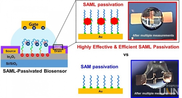 이번에 연구팀이 개발된 기술은 저비용 및 대면적이 가능한 용액공정을 활용하여 자기조립 다중층을 센서 전극의 보호막으로 사용하며 높은 절연특성을 기반으로 안정적인 트랜지스터 기반 바이오센싱 기술을 실현했다.