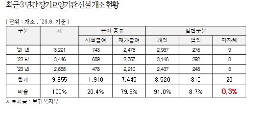 강은미 정의당 의원이 보건복지부로부터 제출받은 최근 3년간 장기요양시기관 신설 개소 현황을 살펴본 결과 총 9355개소 중에 국공립은 0.3%인 단 20개소로 확인됐다. 대부분 민간이 개설한 개인설립 8520개소, 법인설립 815개소로 나타났다.