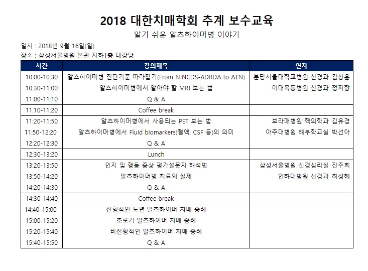 변화에 걸맞게 전임상 알츠하이머병(Preclinical Alzheimer’s Disease)부터 알츠하이머 치매(Alzheimer disease with Dementia)에 이르는 진단기준의 변화, 개발된 바이오마커를 이용한 진단법, 그리고 알츠하이머병의 실질적인 치료를 각 분야를 대표자들을 초빙한다.