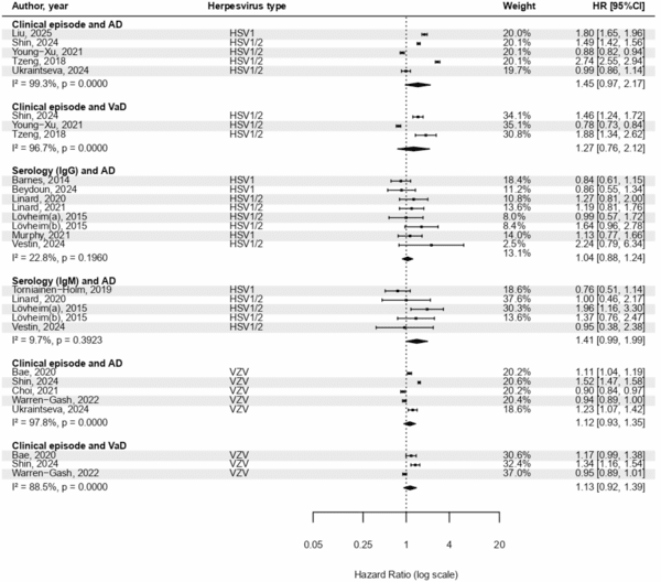 그 결과, 단순헤르페스바이러스(HSV-1, HSV-2) 감염 후 치매 발생 위험은 1.36배(95% CI 1.01–1.83), 수두-대상포진바이러스(VZV) 감염 후 알츠하이머병 발생 위험은 1.12배(95% CI 1.03–1.35)로 나타났다. 그러나 전체 치매(알츠하이머병과 혈관성 치매를 모두 포함한 경우)에서는 1.13배(95% CI 0.92–1.39)로, 통계적으로 유의하지 않았다. 이는 연구 간 이질성이 크고, 연관성이 뚜렷하지 않음을 보여준다.