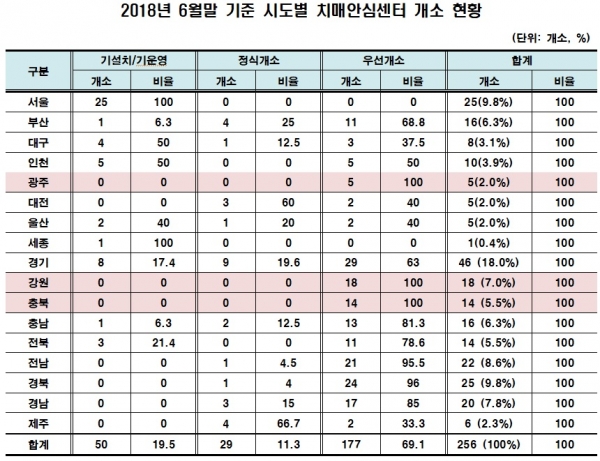 전체의 70%에 달하는 나머지 177개 센터는 ‘우선개소’된 상태로, 정상 운영되고 있지 않다. 특히 광주‧강원‧충북 지역에 위치한 치매안심센터는 모두 우선개소된 곳만 존재하며, 정식개소한 곳은 한군데도 없다.