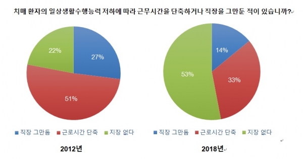 또 근로시간을 단축한 경우도 51%에서 33%로 줄었다. 시간으로 보면 2012년에는 근로시간 단축 시간이 14.55시간이었는데, 2018년에는 10.3시간으로 4시간 가량 축소됐다. 치매환자 때문에 직장생활에 지장이 없다는 응답은 22%에서 53%로 두 배 이상 증가했다.