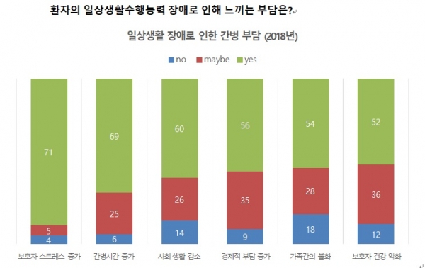 다만 간병에 대한 부담은 전반적으로 크게 줄었다. 2012년 외출에 대해 100명 중 93명이 부담스럽게 느꼈으나, 2018년에는 56명으로 줄었다. 나머지 항목들에 대한 응답도 평균 30~40명 정도가 부담이 덜하다라는 응답을 했다.