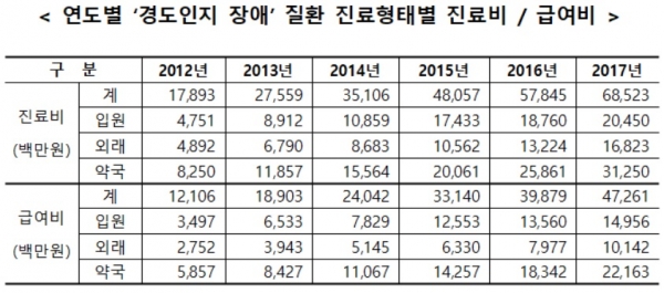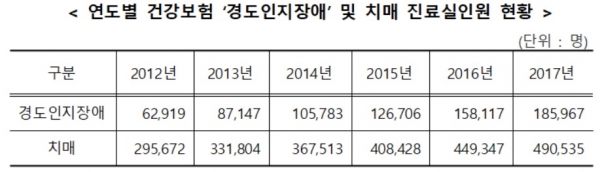 ‘경도인지장애’ 질환의 건강보험 진료비는 2012년 179억원에서 2017년 685억원으로 3.8배, 연평균 30.8% 증가했으며, 급여비는 2012년 121억원에서 2017년 473억원으로 3.9배, 연평균 31.3% 늘었다.