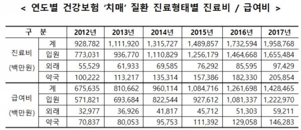 ‘치매’ 질환의 건강보험 진료비는 2012년 9,288억 원에서 2017년 1조9,588억 원으로 2.1배, 연평균 16.1% 증가했으며, 급여비는 2012년 6,756억 원에서 2017년 1조4,285억 원으로 2.1배, 연평균 16.2% 늘었다.