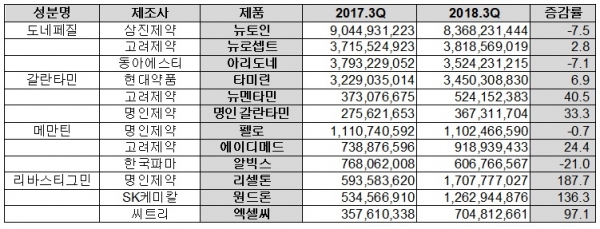 도네페질 성분 제네릭 상위 제품은 뉴토인, 뉴로셉트, 아리도네였다. 뉴토인과 아리도네는 3분기까지 83억6,800만원과 35억2,400만원으로 처방액이 각각 7.5%, 7.1% 줄었다. 뉴로셉트는 38억1,800만원으로 전년 같은 기간보다 2.8% 증가했다.