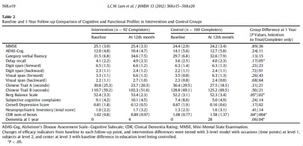표에서 알 수 있듯이 평가 항목이 MMSE 점수 등을 포함해 16항목임을 고려한다면 극히 작은 효과에 불과하다. 더군다나 MMSE 점수와 ADAS-Cog 점수에서는 양 군간에 차이가 없었다. 대표적인 치매 척도인 MMSE와 ADAS-Cog 점수 등 대부분의 지표에서 변화가 없었는데, 치매 발생률에 차이가 있다는 점은 연구 결과에 대한 의문점 중의 하나다.