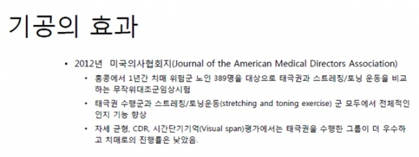 결국 태극권이 일반운동(신체유연/근력운동이)에 비해 뚜렷한 인지기능 향상, 치매 예방 효과가 있다고 결론을 내릴 수 없다.