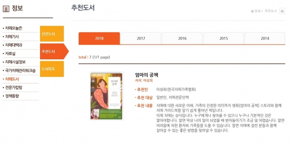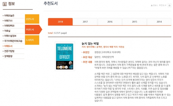 중앙치매센터는 홈페이지를 통해 일반인이나 치매 관련 전문인력 등을 대상으로 치매 관련 도서를 소개하고 있다.