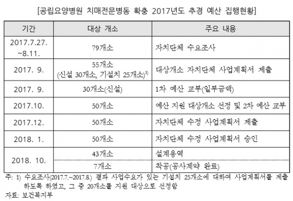 2017년 공립요양병원 치매전문병동 설치를 위한 추경 예산의 집행현황을 보면, 수요 조사나 사업계획서 제출, 예산 교부 등은 진행됐으나 2017년 말 자치단체에서 실제로 집행한 사례는 없었다.