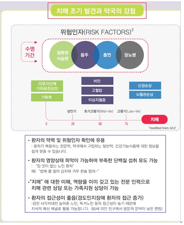 이를 통해 치매 조기 발견에 있어 약국의 강점을 ▲ 환자의 약력 위험인자 확인에 유용 ▲ "치매"에 대한 이해, 역량을 이미 갖고 있는 전문 인력으로 치매 관련 상담 또는 가족지원 상담이 가능 ▲ 환자의 접근성이 좋음(경도인지장애 환자의 접근 증가) 등으로 설명하고, 약국에서 원스톱 치매 상담 툴을 제공할 수 있다고 광고했다.