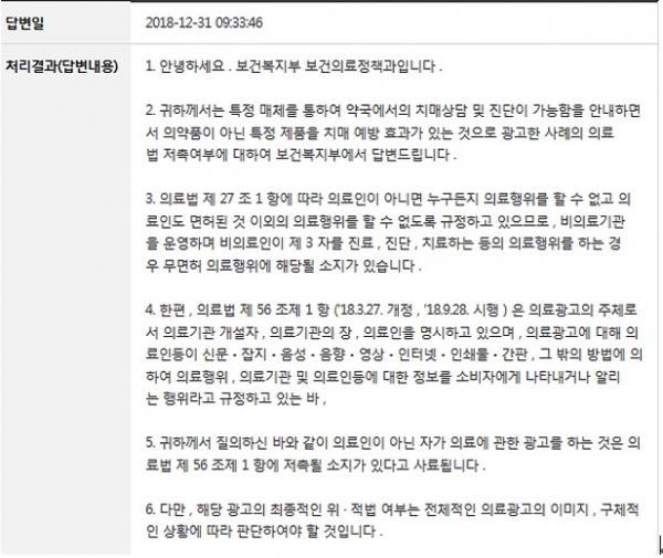 바른의료연구소는 “복지부의 회신내용을 근거로 관할 지자체에 엄격한 처분을 요청하는 민원을 신청했다”며 “또 의약품 오인광고 여부에 대해 식약처에 재차 민원을 신청했다”고 말했다.