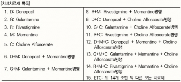 대상이 된 치매약 성분은 도네페질, 갈란타민, 리바스티그민, 메만틴, 콜린알포세레이트였으며, 병용 처방까지 15개 조합에 대한 처방인원을 조사했다.