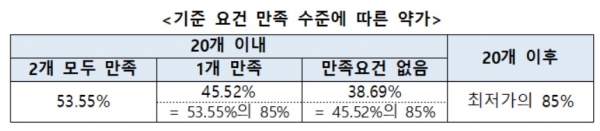 일단 2개 기준 요건을 모두 충족하면 현재와 같이 오리지널 의약품 가격의 53.55%로 가격이 산정된다. 1개 조건을 충족할 경우 53.55%의 85%인 45.52%, 1개도 충족하지 못할 경우에는 45.52%의 85%인 38.69%까지 떨어진다.