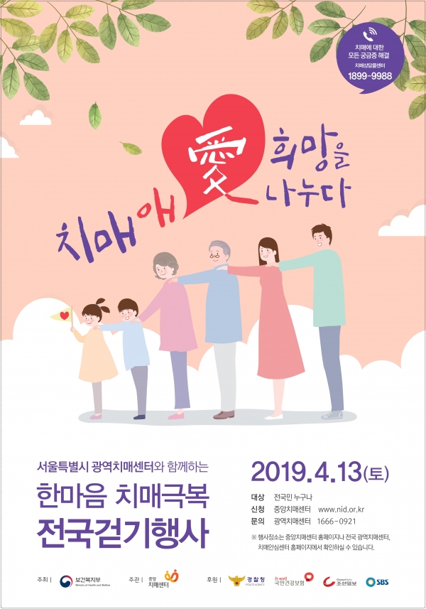 중앙치매센터는 오는 3월 30일부터 5월 25일까지 전국 38개 지역에서 ‘2019 한마음 치매극복 전국걷기행사’가 개최된다고 28일 밝혔다.