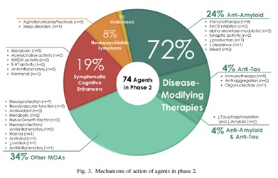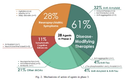 3상 임상시험의 경우에는, 28개 후보물질로 42개 임상시험이 진행 중이다. 17개(61%)가 질환조절을 목표로 하고 있으며, 그 중 항아밀로이드 치료제가 9개(32%)로 가장 많았다. 인지기능개선제는 3개 물질, 이상증상 치료제는 8개였다.