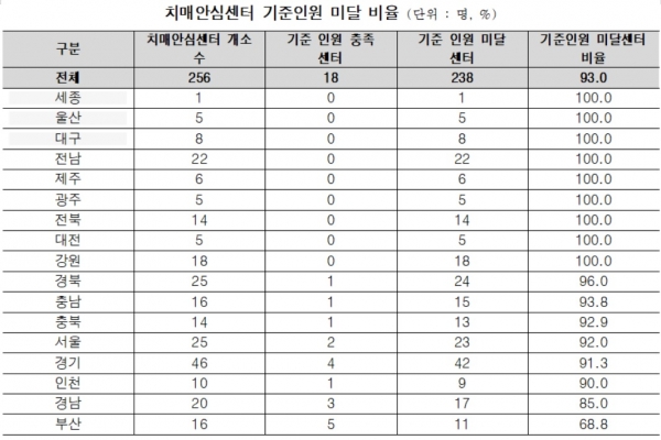 전국 256개의 치매안심센터 중 이 기준을 만족하고 있는 곳은 18개(7%)에 불과했으며, 나머지 238개(93%)는 인력 부족 문제를 겪고 있었다.