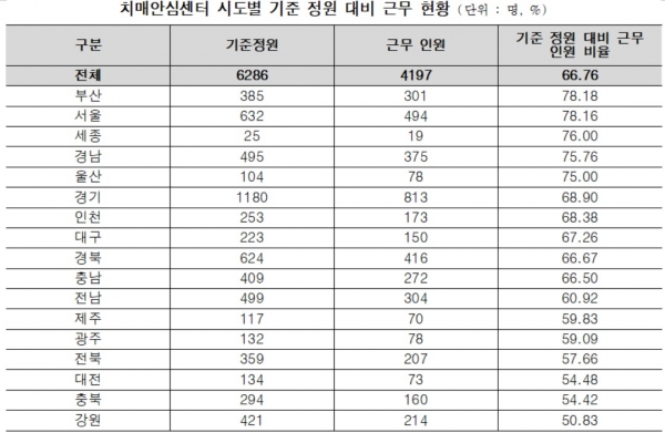 보건복지부가 설정한 치매안심센터의 전체 인력 정원인 6,284명 중 실제로 채용돼 현재 근무하고 있는 인력은 4,197명으로 인력충족 비율이 67% 수준이었다.