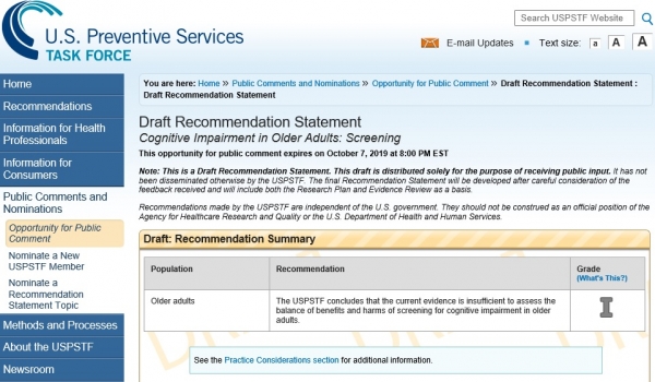 최근 미국질병예방서비스태스크포스(USPSTF, The United States Preventive Services Task Force)는 노년층 인지장애에 대한 권고안 초안을 공개했다.