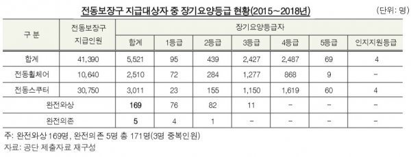 정부 규정에 따르면, 장애요양등급 판정자 중 치매 등 인지장애가 있거나 완전와상인 환자에 대해서는 전동보장구 구입비용을 원칙적으로 지급하지 않도록 돼 있다.