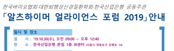 알츠하이머 얼라이언스 포럼 2019가 오는 10월 30일 오전 9시 한국산업은행 본점 1층 IR센터에서 개최된다.