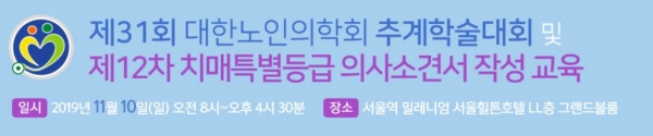 대한노인의학회 추계학술대회와 치매특별등급 의사소견서 교육이 오는 11월 10일 오전 8시부터 서울역 밀레니엄 힐튼호텔 LL층 그랜드볼룸에서 개최된다.