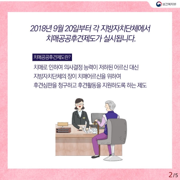 복지부는 치매노인 공공후견제도를 통해 중등도 이상의 치매를 겪는 65세 저소득층 노인 가운데 자신의 사무를 대신할 수 있는 가족이나 주변 사람이 없는 경우 나라에서 후견인을 지원해 주고 있다.