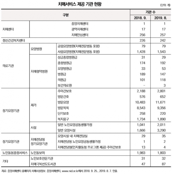 해당 보고서에는 2018년과 2019년 치매서비스 제공기관 현황 변화에 대한 내용을 담고 있다.