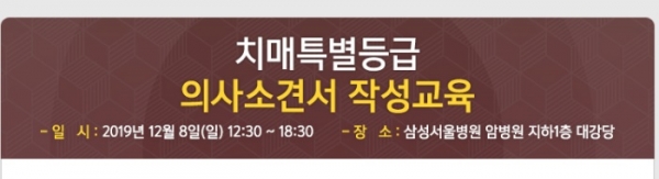 대한치매학회가 오는 12월 8일 오후12시30분부터 삼성서울병원 암병원 지하1층 대강당 치매특별등급 의사소견서 작성교육을 개최한다.
