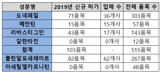 지난해 도네페질 성분 제네릭은 총 36개사, 71개 제품이 허가를 받았다. 전체 허가 품목은 303개로 대폭 늘었다.