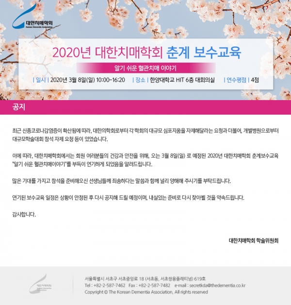 대한치매학회 춘계 보수교육 일정 연기 교육·행사 입력 2020.02.17 13:37 수정 2025.02.27 15:28 기자명 조재민 기자 jjm5352@dementianews.co.kr 바로가기 기사스크랩하기 다른 공유 찾기 본문 글씨 줄이기 가 본문 글씨 키우기 이 기사를 공유합니다 연기된 보수교육 일정 차후 공지 예정 대한치매학회 춘계 보수교육이 신종코로나감염증 확산에 따라 연기된다. 대한의학회로부터 각 학회의 대규모 심포지엄 자제 권고에 따른 것으로 자세한 일정은 차후 공지할 예정이다. 키워드 #대한치매학회 #춘계보수교육 #대한의학회 조재민 기자 jjm5352@dementianews.co.kr 다른 기사 보기 관련기사 대한뇌전증학회, 코로나 여파 미니펠로우쉽 행사 연기 신종 코로나바이러스 확산에 치매안심센터도 '영향권' 대한신경과의사회 춘계학술대회 일정 변경 안내 노인신경의학회, 춘계학술대회 연기 대한퇴행성신경질환학회 정기학술대회 일정 연기 대한노인의학회 춘계학술대회 연기 대한치매학회, 코로나19 확산에 춘계학술대회 '취소' 치매학회, 이사장에 고대 신경과 박건우 교수 선출 저작권자 © 디멘시아뉴스(dementianews) 무단전재 및 재배포 금지 개의 댓글 회원로그인 작성자 비밀번호 댓글 내용입력 댓글 정렬 최신순 추천순 답글순 BEST댓글 BEST 댓글 답글과 추천수를 합산하여 자동으로 노출됩니다. 닫기 더보기 댓글삭제 삭제한 댓글은 다시 복구할 수 없습니다. 그래도 삭제하시겠습니까? 비밀번호 댓글수정 댓글 수정은 작성 후 1분내에만 가능합니다. 본문 / 400 비밀번호 내 댓글 모음 닫기