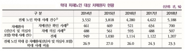 10일 복지부 자료에 따르면, 2018년 전체 노인학대 5,188건 중 치매노인은 1,207명으로 23.3%를 차지했다.