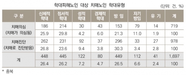 이는 2018년 한 해 동안 전국 31개 지역노인보호전문기관을 통한 전체 노인 학대 신고 건수 중 학대로 판정된 사례를 분석한 결과다.