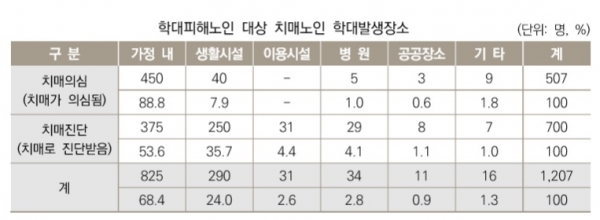 특히 치매의심과 치매진단의 세부 유형에서도 모두 가정 내가 각각 450건(88.8%), 375건(53.6%)으로 가장 높게 나타나 치매노인의 주 부양자가 주로 가정에 집중돼 있는 것으로 분석됐다.