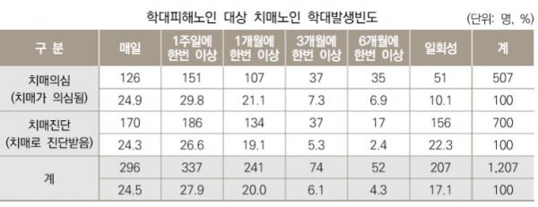 특히 매일 학대가 발생하는 비율(24.5%)이 전체 학대피해노인이 매일 학대를 경험하는 비율(13.3%)보다 11.2%p 높은 것으로 나타났다. 이는 치매노인은 더욱 잦은 빈도로 학대받을 경향이 높다는 것을 의미했다.
