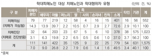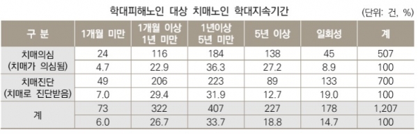 학대 지속기간 중 1년 이상인 경우가 634건(52.5%)으로 과반을 차지한다는 결과는 치매노인이 장기간 학대에 노출돼 있다는 것을 뜻했다.