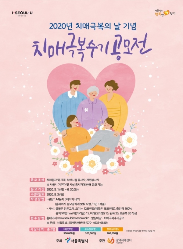 나백주 서울시 시민건강국장은 “가족, 종사자들은 희망과 용기를 더하고 이웃들은 치매에 대한 편견을 없애는 기회가 될 수 있도록 공모전에 많은 참여를 바란다”고 말했다.