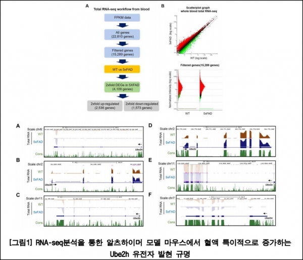 연구팀은 전사체 분석기법을 통해 알츠하이머 질환 환자의 유전자 발현량을 분석한 결과, E2 효소군에 속하는 Ube2h라는 유전자가 혈액에서 특이적으로 증가함을 발견했다.