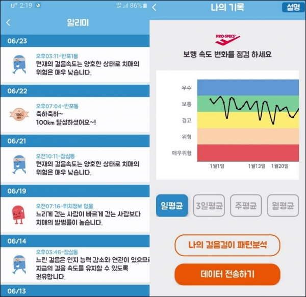 해당 제품은 스마트폰의 ‘프로스펙스 워킹 케어 인솔 앱’과 연동해 사용하며 앱의 ‘나의 기록’에서 ‘걸음속도와 좌/우 균형감 변화’를 점검하고, 알림 메시지를 통해 현재 치매 위험도에 대한 정보를 받을 수 있다.