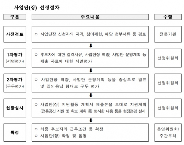 이 후 이의신청을 거쳐 연구에 대한 미비점을 보완하고, 단장지원서를 바탕으로 선정위원회의 현장점검 등이 진행됐다.